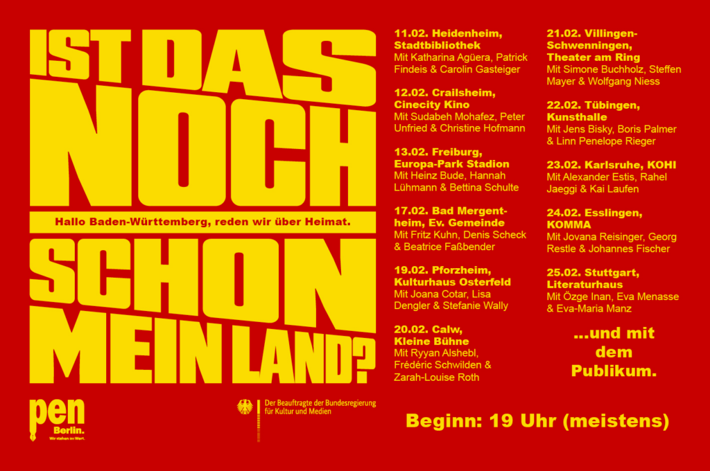 Die Autorenvereinigung PEN Berlin geht in den Südwesten Deutschlands und veranstaltet in 22 größeren und kleineren Orten in Baden-Württemberg eine Gesprächsreihe – der Auftakt einer großen Serie, der weitere Veranstaltungen folgen werden: im März in Rheinland-Pfalz, im August und September in Sachsen-Anhalt, Mecklenburg-Vorpommern und Berlin.