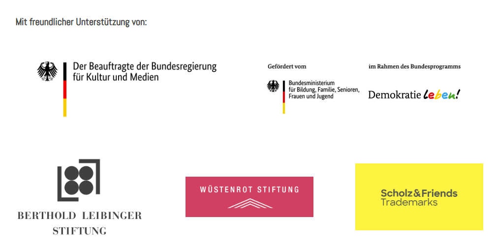 Einen Überblick über alle 22 Veranstaltungsorte und 66 Teilnehmer:innen finden Sie hier. Wir bedanken uns beim Deutschen Bundestag, dem Bundesbeauftragten für Kultur und Medien, dem Bundesprogramm »Demokratie leben!« und dem Bundesministerium für Bildung, Familie, Senioren, Frauen und Jugend, der Berthold Leibinger Stiftung, der Wüstenrot Stiftung sowie der Agentur Scholz & Friends für ihre Unterstützung. Ganz besonders danken wir allen mitwirkenden Einrichtungen.