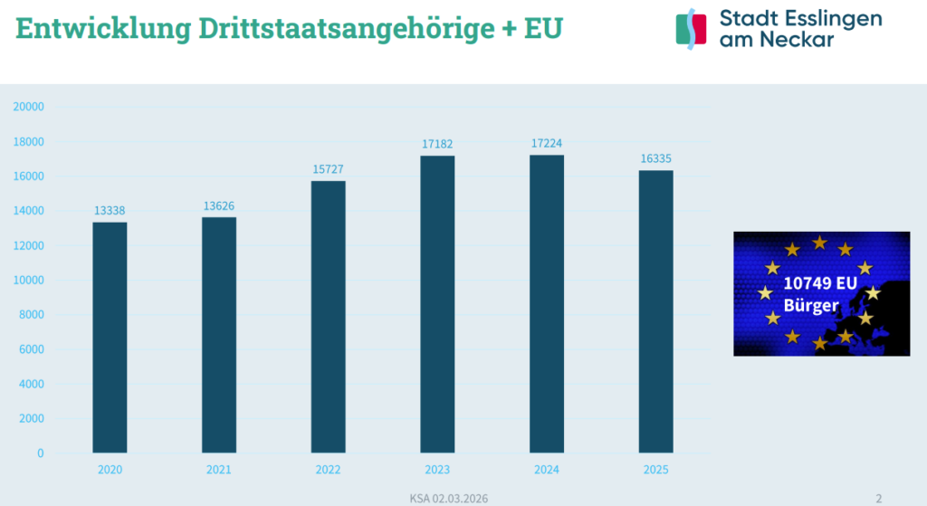 Drittstaatsangehörige Bürger (Nicht-EU-Ausländer ohne deutschen Pass): 16.335 (17%) – minus 5% gegen über 2024.