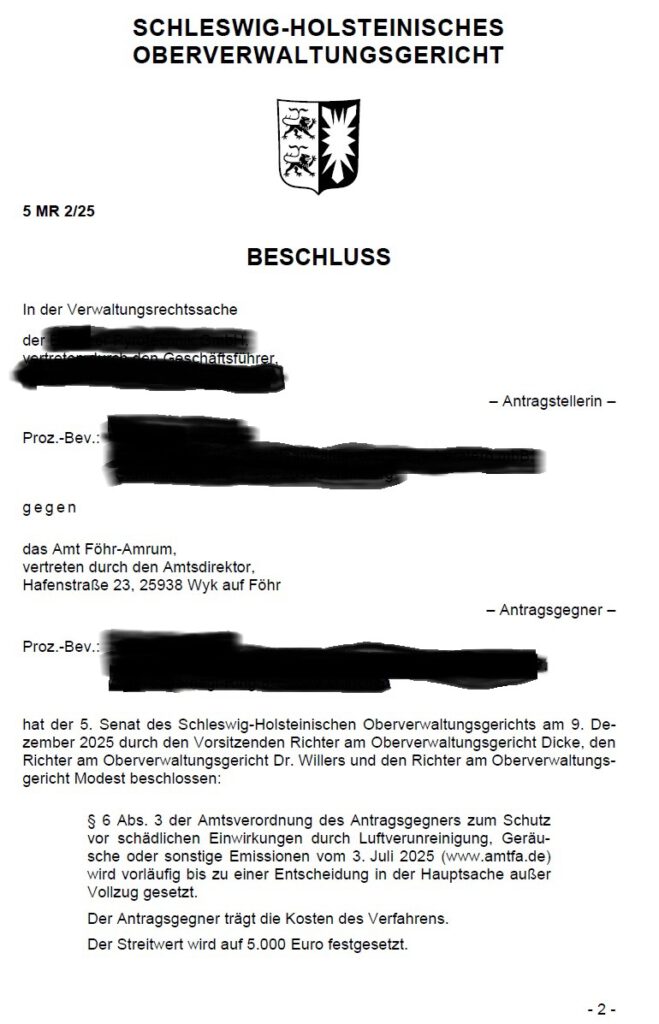 Die Antragstellerin wendet sich im Wege des vorläufigen Rechtsschutzes gegen § 6 Abs. 3 der vom Amtsdirektor des Antragsgegners erlassenen Amtsverordnung zum Schutz vor schädlichen Einwirkungen durch Luftverunreinigung, Geräusche oder sonstige Emissionen vom 3. Juli 2025 (www.amtfa.de). Unter Berücksichtigung von § 2 der Amtsverordnung ist danach das Verwenden (Abbrennen) von pyrotechnischen Gegenständen der Kategorie 2 gemäß § 23 Abs. 2 der Ersten Verordnung zum Sprengstoffgesetz (1. SprengV) auch am 31. Dezember und 1. Januar im gesamten Bereich des Antragsgegners auf den Inseln Föhr und Amrum verboten.
