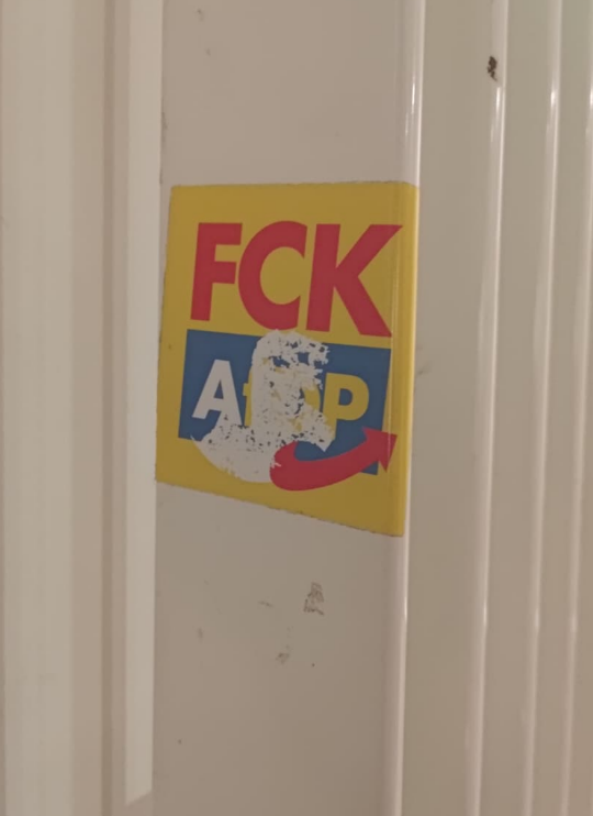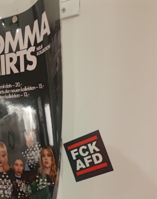 - zu den Aufklebern: Es sind Fuck-AfD Aufkleber, welche junge Menschen so bei sich haben und die kleben es, die Mitarbeiterinnen und Mitarbeiter nicht. 🤣