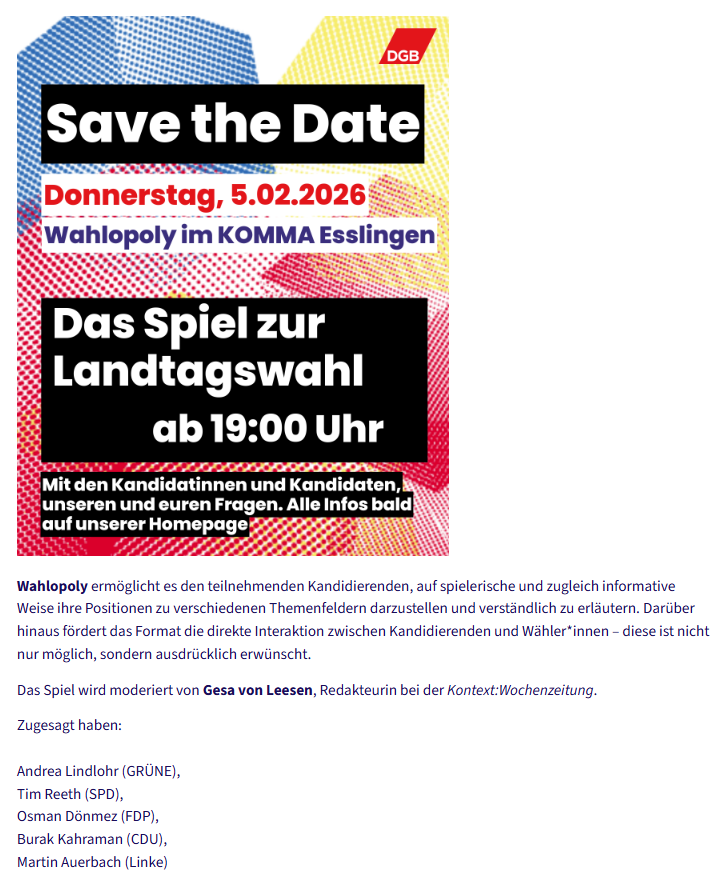 - zu Wahlopoly: Wir haben Situationen, wo wir Räume zum Beispiel an den Deutschen Gewerkschaftsbund überlassen. Da würden wir uns nicht getrauen, sozusagen vorzuschreiben, wen denn da der Veranstalter auch einzuladen hat. 🤣
