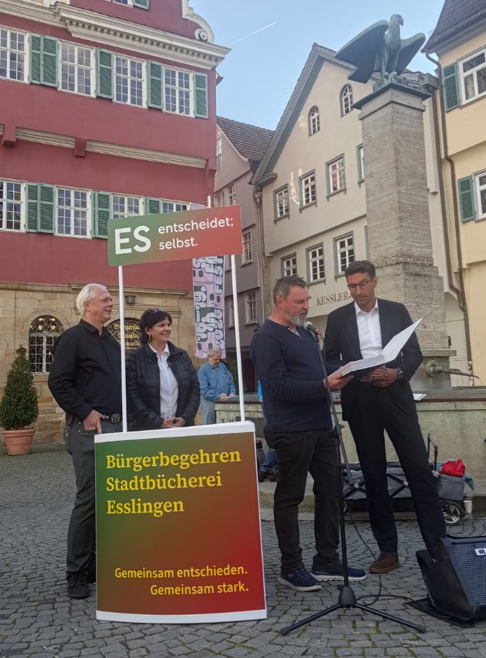 Danke an die Initiatoren des Bürgerbegehrens: Rena Farquhar (FDP/Volt, im Bild die zweite von links), Hermann Beck (Wir/Sportplätze erhalten, im Bild der zweite von rechts) und Martin Auerbach (Linke/FÜR, im Bild links) die mit dem neuen Bürgerentscheid erreichen, dass die Esslingerinnen und Esslinger entscheiden dürfen, ob die Bücherei im Pfleghof bleibt oder sie lieber den Kauf des Kögel-Gebäudes und den Umzug der Bibliothek wollen.