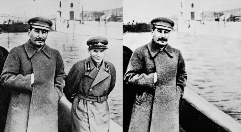 Nikolai Jeschow (auf dem linken Bild rechts) wurde von allen Fotos entfernt, nachdem er bei Josef Stalin in Ungnade gefallen war.