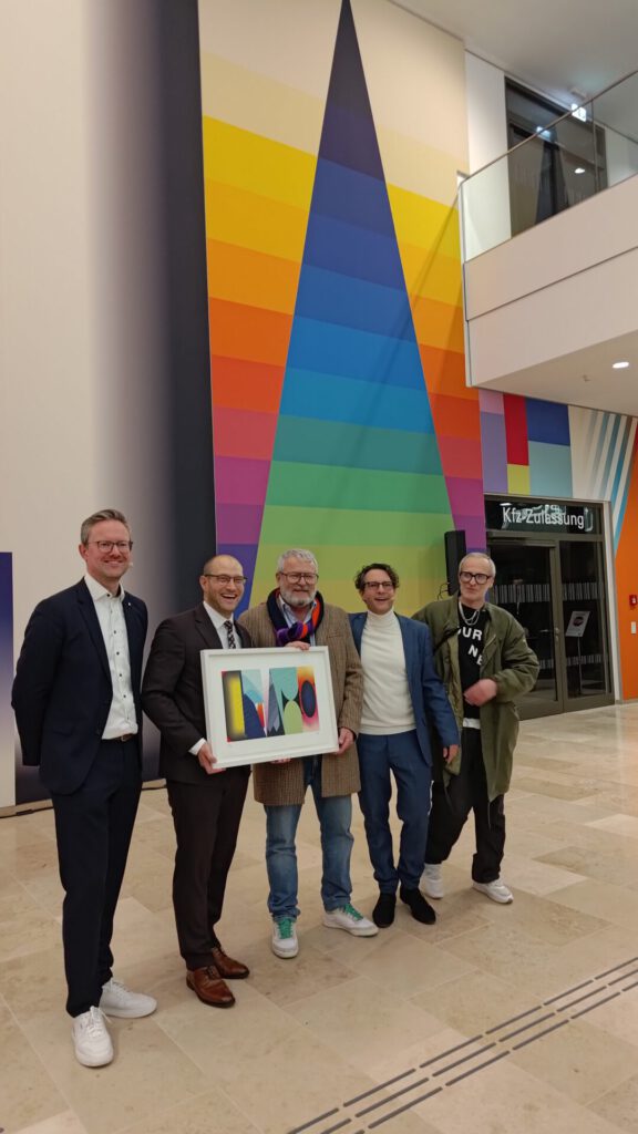 Im Bild von links nach rechts: Christian Greber (Amtsleiter), Marcel Musolf (Landrat), Tobias Rehberger, Dr. Tobias Wall (Berater des Landkreises in Sachen Kunst), Chris Rehberger (Künstler und Sohn von Tobias Rehberger)