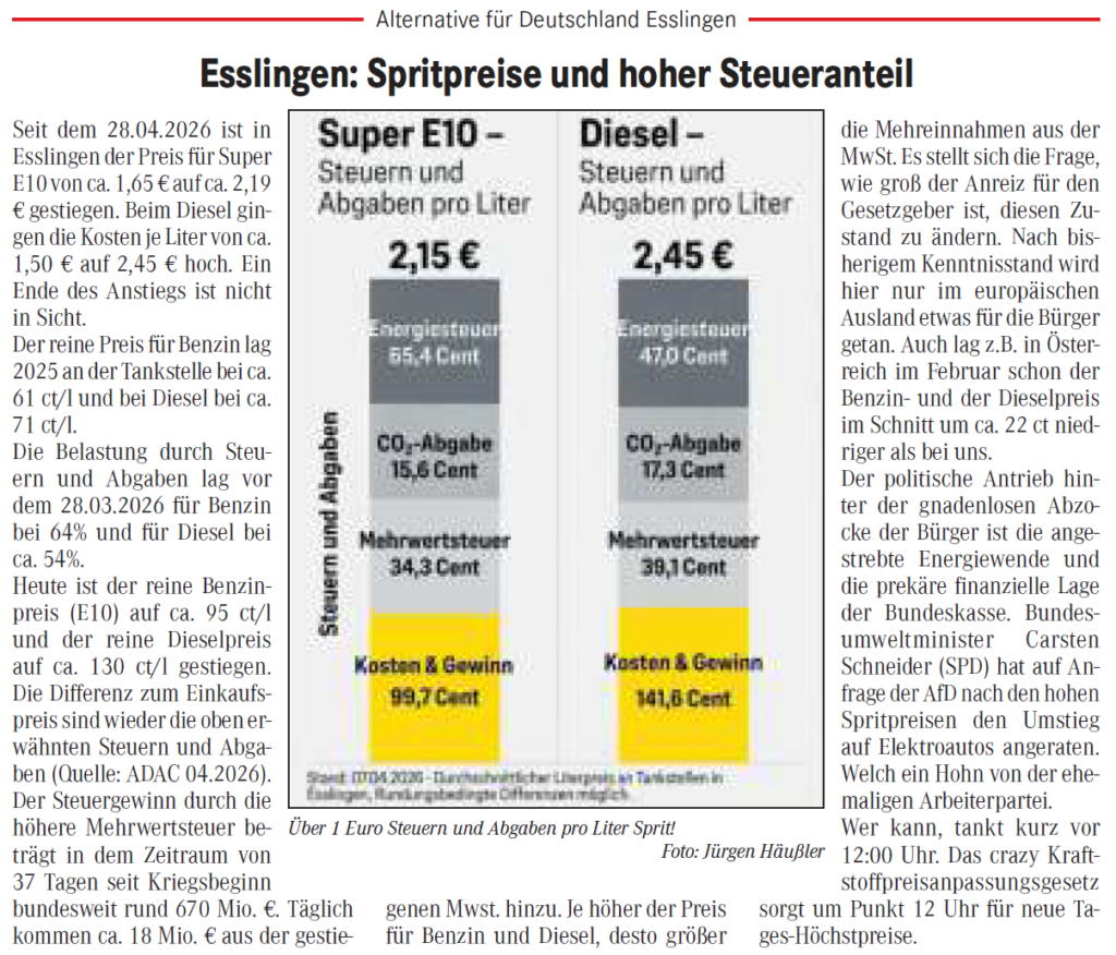 Seit dem 28.04.2026 ist in Esslingen der Preis für Super E10 von ca. 1,65 € auf ca. 2,19 € gestiegen. Beim Diesel gingen die Kosten je Liter von ca. 1,50 € auf 2,45 € hoch. Ein Ende des Anstiegs ist nicht in Sicht. Der reine Preis für Benzin lag 2025 an der Tankstelle bei ca. 61 ct/l und bei Diesel bei ca. 71 ct/l. Die Belastung durch Steuern und Abgaben lag vor dem 28.03.2026 für Benzin bei 64% und für Diesel bei ca. 54%. Heute ist der reine Benzinpreis (E10) auf ca. 95 ct/l und der reine Dieselpreis auf ca. 130 ct/l gestiegen. Die Differenz zum Einkaufspreis sind wieder die oben erwähnten Steuern und Abgaben (Quelle: ADAC 04.2026). Der Steuergewinn durch die höhere Mehrwertsteuer beträgt in dem Zeitraum von 37 Tagen seit Kriegsbeginn bundesweit rund 670 Mio. €. Täglich kommen ca. 18 Mio. € aus der gestiegenen Mwst. hinzu. Je höher der Preis für Benzin und Diesel, desto größer die Mehreinnahmen aus der MwSt. Es stellt sich die Frage, wie groß der Anreiz für den Gesetzgeber ist, diesen Zustand zu ändern. Nach bisherigem Kenntnisstand wird hier nur im europäischen Ausland etwas für die Bürger getan. Auch lag z.B. in Österreich im Februar schon der Benzin- und der Dieselpreis im Schnitt um ca. 22 ct niedriger als bei uns. Der politische Antrieb hinter der gnadenlosen Abzocke der Bürger ist die angestrebte Energiewende und die prekäre finanzielle Lage der Bundeskasse. Bundesumweltminister Carsten Schneider (SPD) hat auf Anfrage der AfD nach den hohen Spritpreisen den Umstieg auf Elektroautos angeraten. Welch ein Hohn von der ehemaligen Arbeiterpartei.
