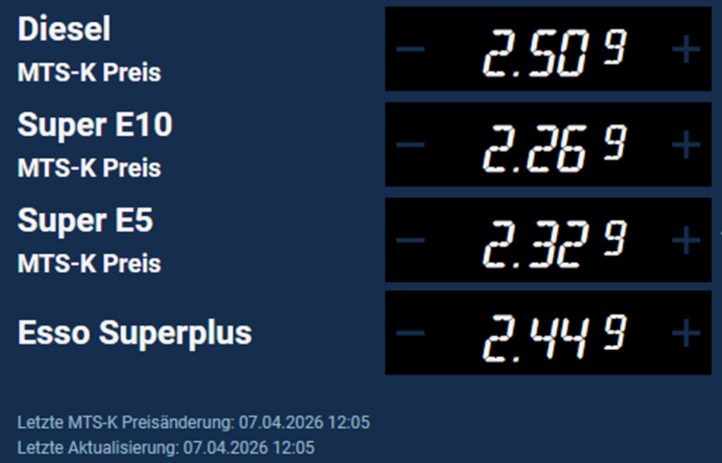 Esso-Tankstelle Ulmer Str. 83, 73728 Esslingen, am 07.04.2026 um 12:05 Uhr – nur 20 Minuten später: