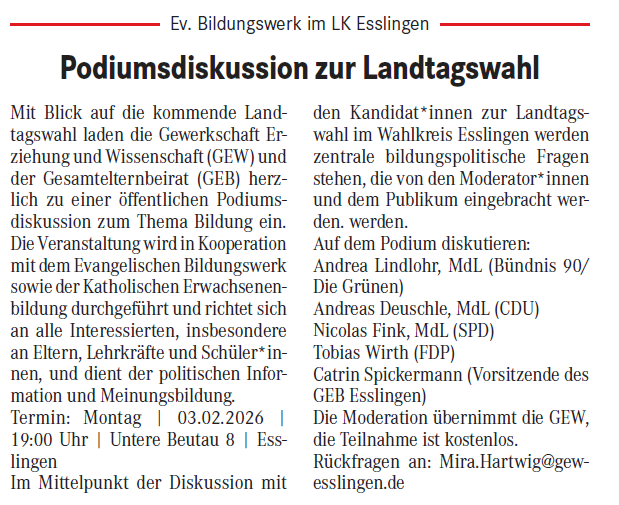 am 03.02.2026 veranstalten Sie, bzw. die Gewerkschaft Erziehung und Wissenschaft (GEW) und der Gesamtelternbeirat (GEB), eine Podiumsdiskussion mit Kandidatinnen und Kandidaten zur Landtagswahl im Wahlkreis Esslingen 07.