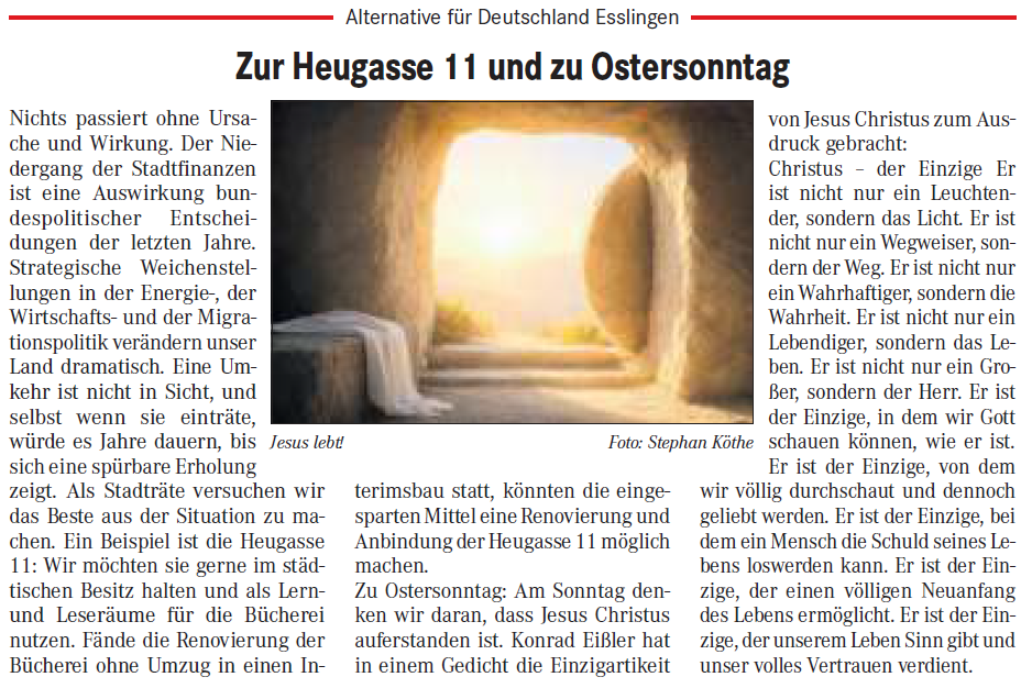 Nichts passiert ohne Ursache und Wirkung. Der Niedergang der Stadtfinanzen ist eine Auswirkung bundespolitischer Entscheidungen der letzten Jahre. Strategische Weichenstellungen in der Energie-, der Wirtschafts- und der Migrationspolitik verändern unser Land dramatisch. Eine Umkehr ist nicht in Sicht, und selbst wenn sie einträte, würde es Jahre dauern, bis sich eine spürbare Erholung zeigt. Als Stadträte versuchen wir das Beste aus der Situation zu machen. Ein Beispiel ist die Heugasse 11: Wir möchten sie gerne im städtischen Besitz halten und als Lern- und Leseräume für die Bücherei nutzen. Fände die Renovierung der Bücherei ohne Umzug in einen Interimsbau statt, könnten die eingesparten Mittel eine Renovierung und Anbindung der Heugasse 11 möglich machen.
